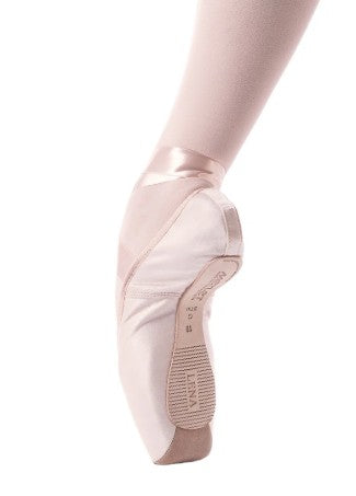 LENA is a traditionally French made pointe shoe using the stitch and turn technique which ensures all of the materials are tucked into the shoe for a seamless feel. Features either a STM polycarbonate unbreakable shank or a 3/4 Hard. LENA has a perfection box which is perfectly smooth and durable along with a medium platform for extra stability. Suitable for intermediate to advance dancers.